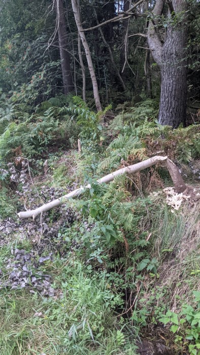 Der Biber hat seinen erlegten Baum soweit möglich in Einzelteile zerlegt. Leider hat die Kombination Biberdamm und starke Regenfälle dem Wiesengrund etwas zugesetzt.