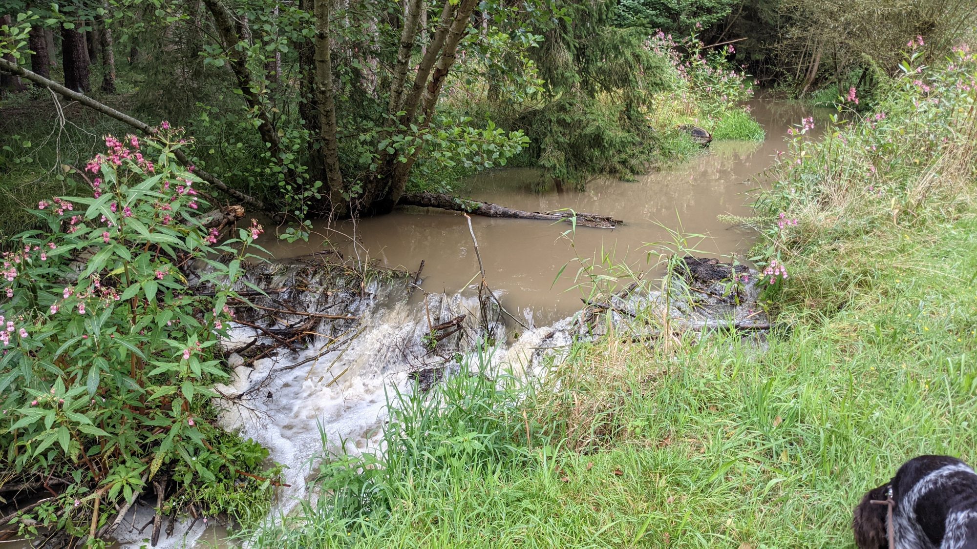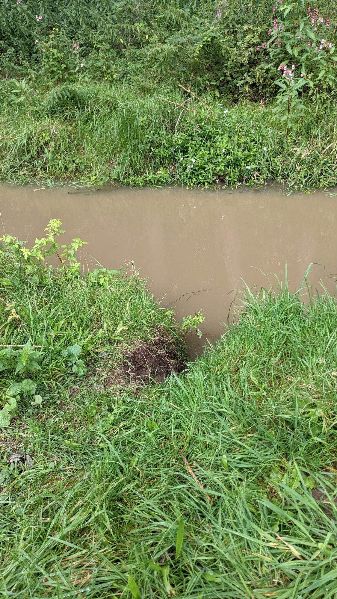 Die letzten Tage hat es gut geregnet, und so ist der Pegel im Mühlbach um einen knappen Meter gestiegen. Das Wasser hat sich einen Weg um den Damm des Bibers herum gesucht. Der Wiesenrand ist dadurch leider schon an ein paar Stellen schon eingebrochen.