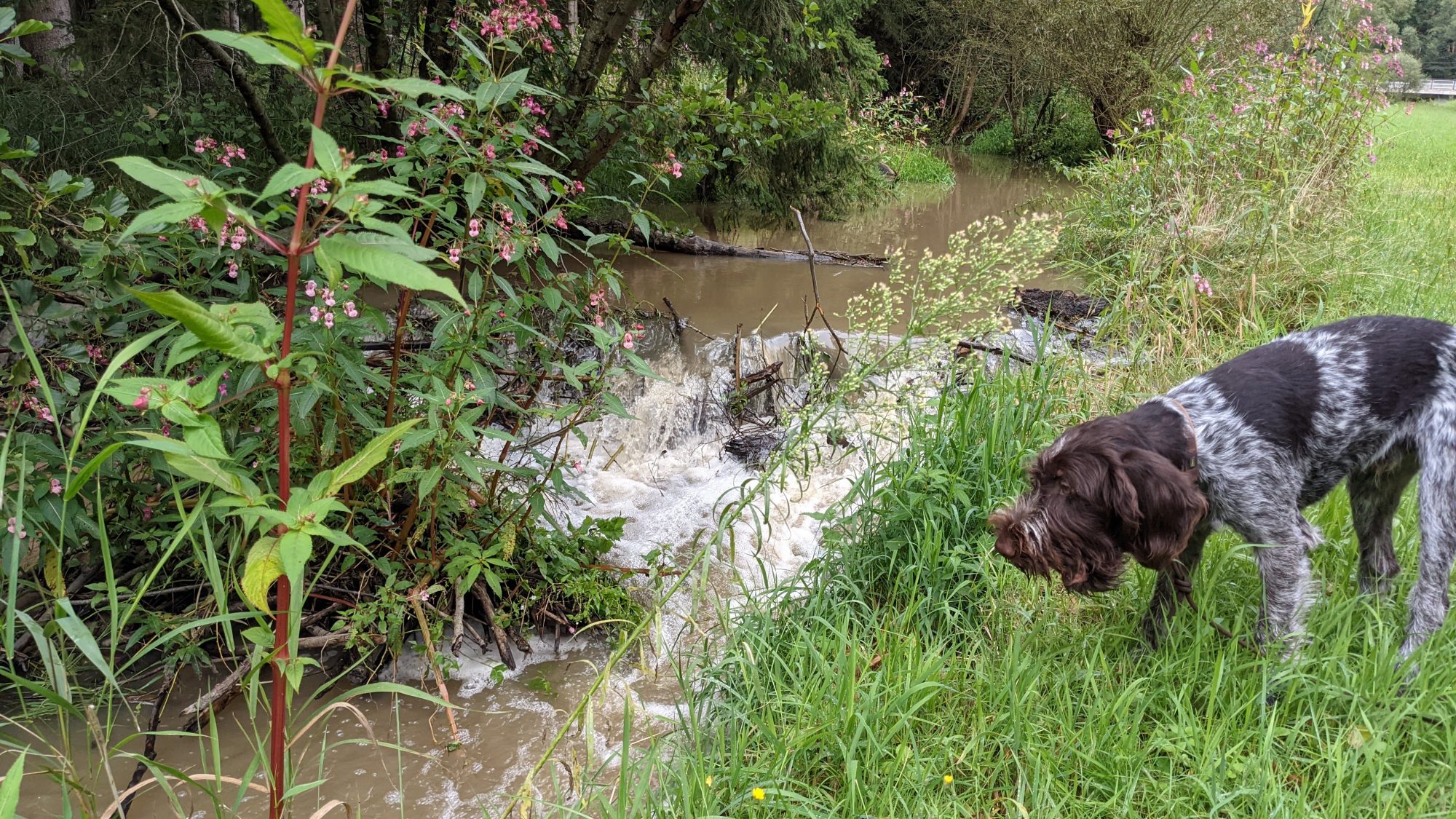 Vor den Übungseinheiten mit Rübe gibt es immer eine kleine Runde durch den Wiesengrund. Um den Hund etwas zu entspannen und natürlich um zu schauen ob es irgendwelche Schäden gibt. 20 Meter vor uns haben wir den Biber gerade noch ins Wasser steigen sehen. Er war auf der anderen Bachseite mit Fellpflege beschäftigt als er uns bemerkt hat.