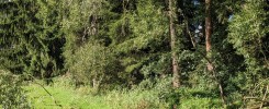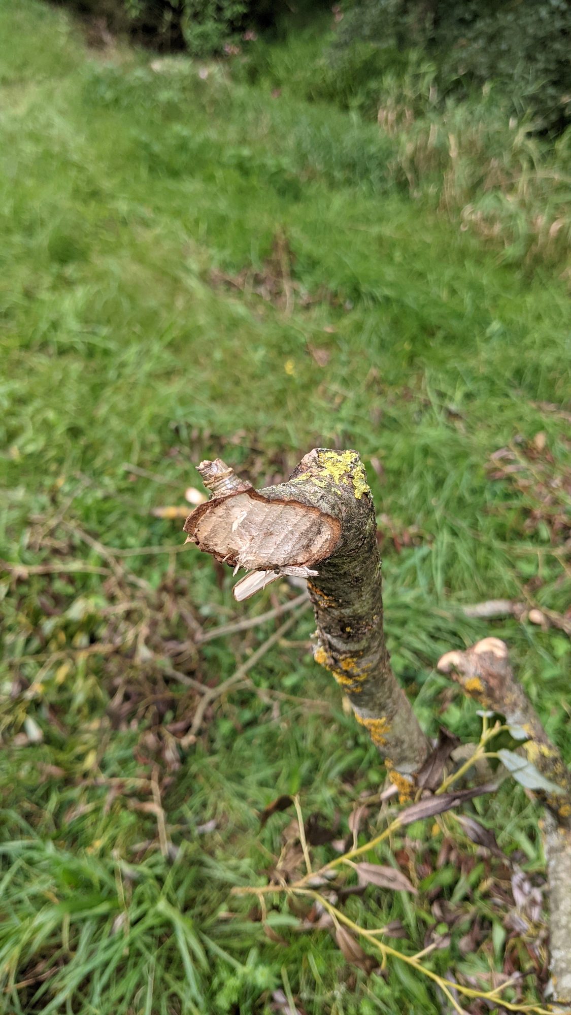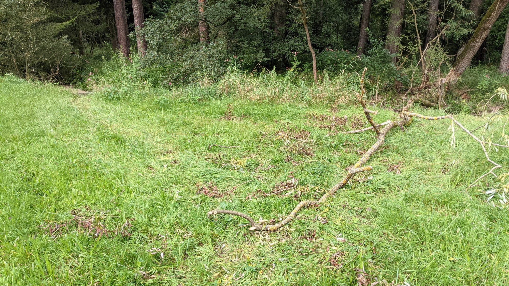 Der Biber hat seinen erlegten Baum soweit möglich in Einzelteile zerlegt. Leider hat die Kombination Biberdamm und starke Regenfälle dem Wiesengrund etwas zugesetzt.