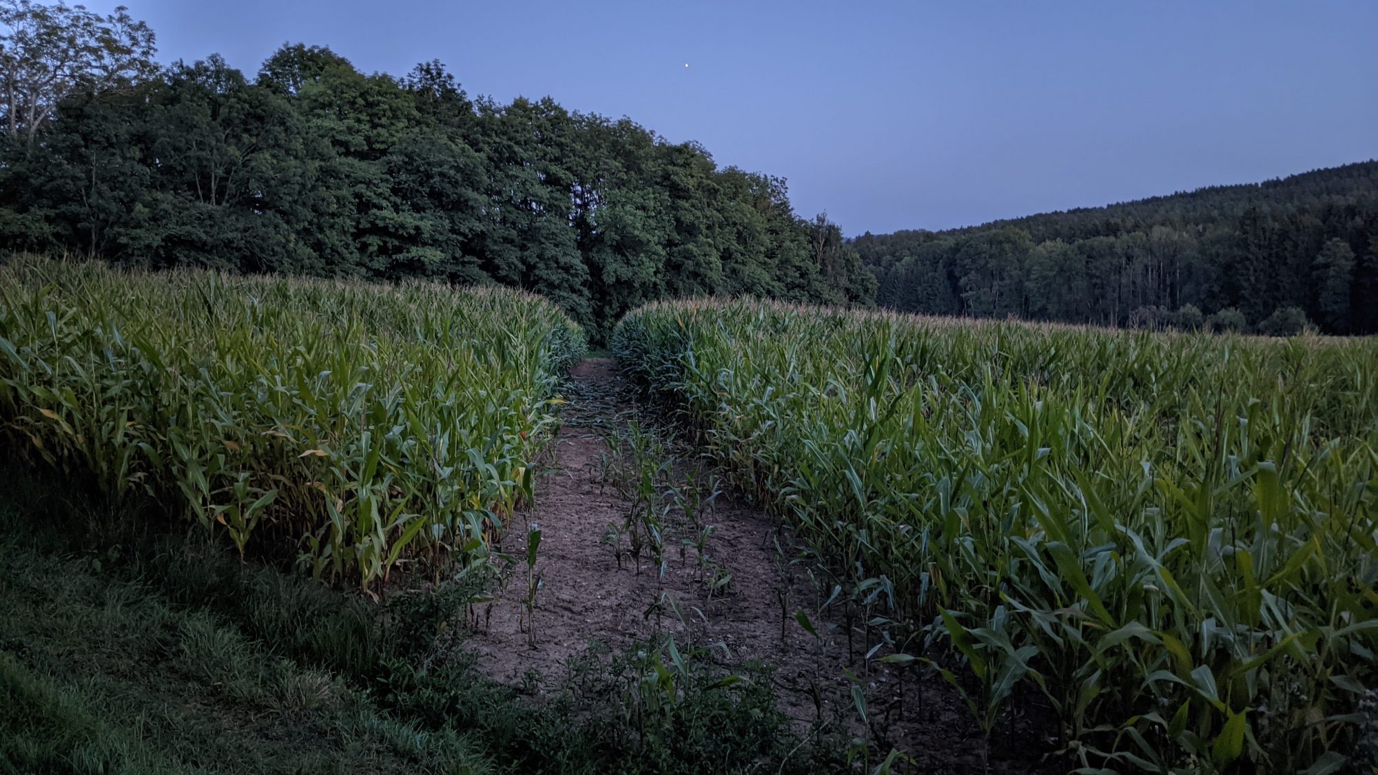 Um kurz nach 19 Uhr habe ich mich mit dem Pächter vor Ort getroffen und mich einweisen lassen. Die Sauen waren die letzten Nächte immer wieder vor Ort und haben es sich im Mais gut gehen lassen. Gesessen bin ich dann letztlich von 20:00 Uhr bis kurz nach 02:00 Uhr Nachts.
