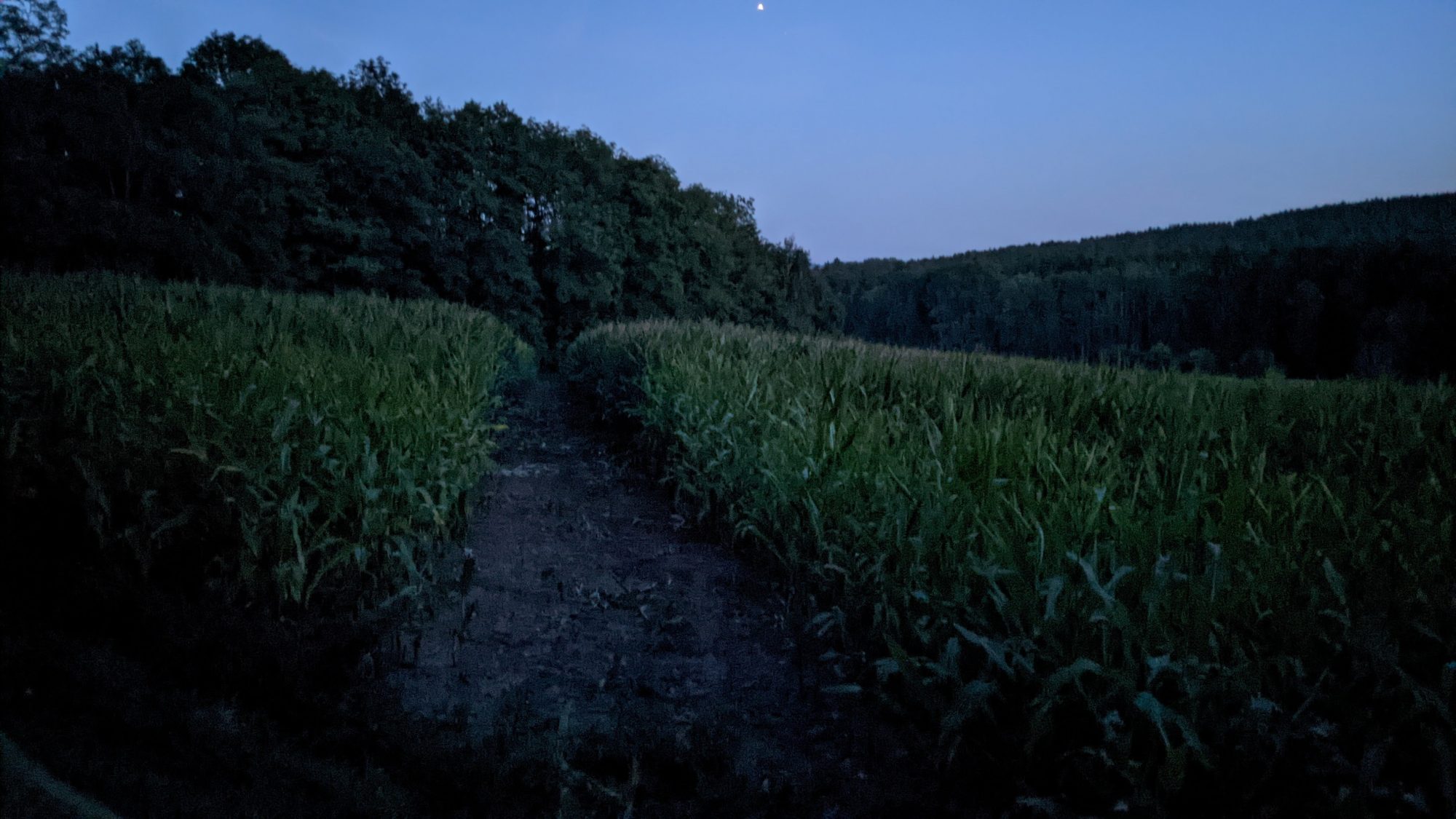 Nachdem vorgestern an gleicher Stelle ein Überläufer vier Meter vor mir aufgeschreckt hatte wollte ich es heute Nacht nochmal wissen. Also auf zu Sauen im Mais – Teil 3.